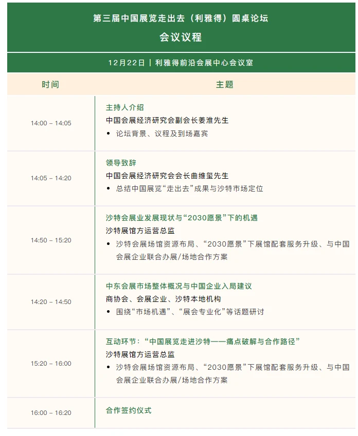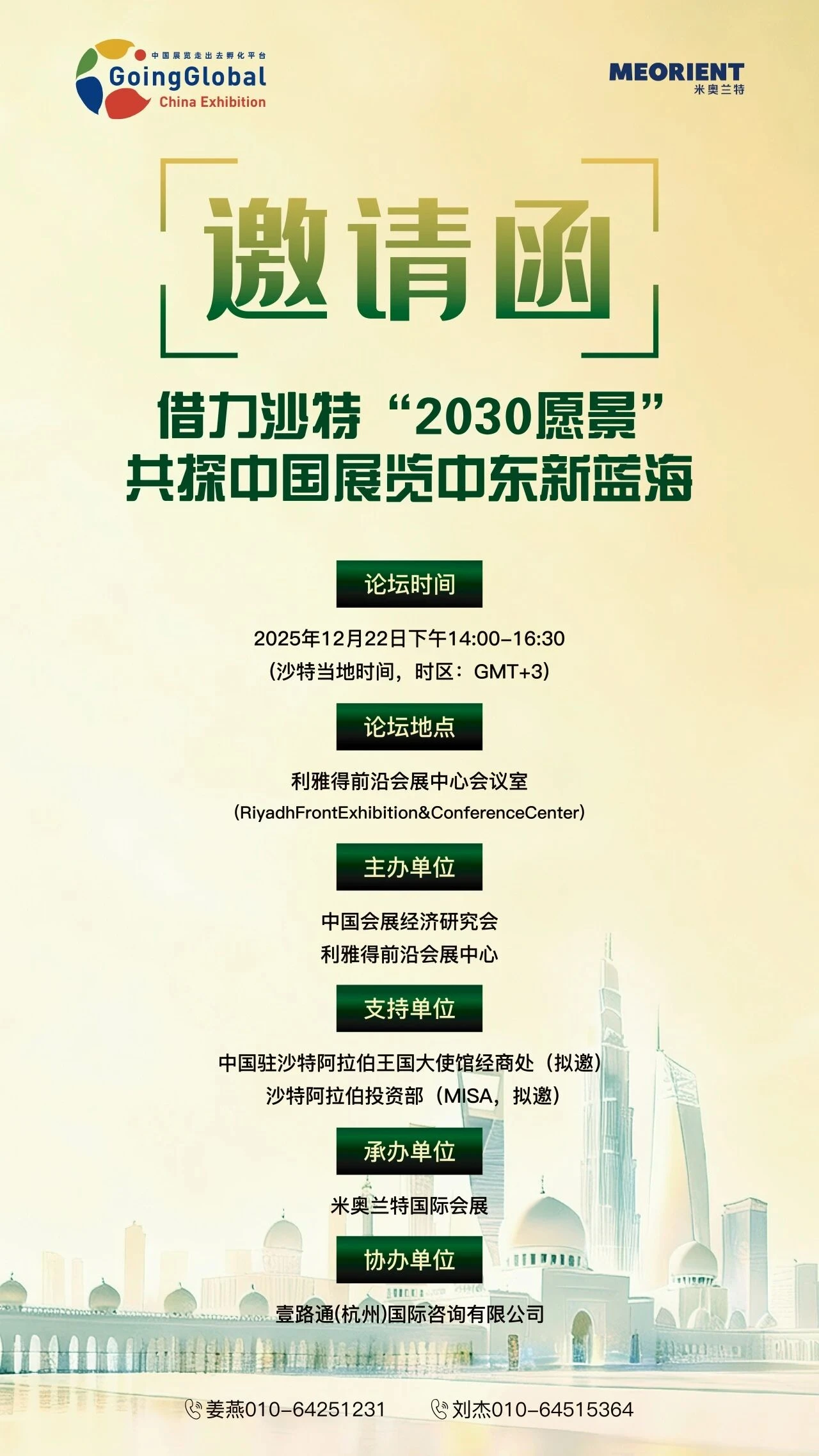 2025年,正值中沙建交35周年之际,双方在深化共建“一带一路”倡议与沙特“2030愿景”战略对接方面达成重要共识,为两国在基础设施建设、贸易投资、会展服务等领域的务实合作开辟了广阔空间。为了进一步推动这一进程,由中国会展经济研究会与利雅得前沿会展中心主办,米奥兰特国际会展承办的“第三届中国展览走出去(利雅得)圆桌论坛”将于2025年12月22日在沙特·利雅得前沿会展中心隆重举行。该论坛将作为2025年沙特中国出口品牌联展(12月22日–24日)的重要同期活动同步举行,实现“展会+论坛”双轮驱动、资源共振。