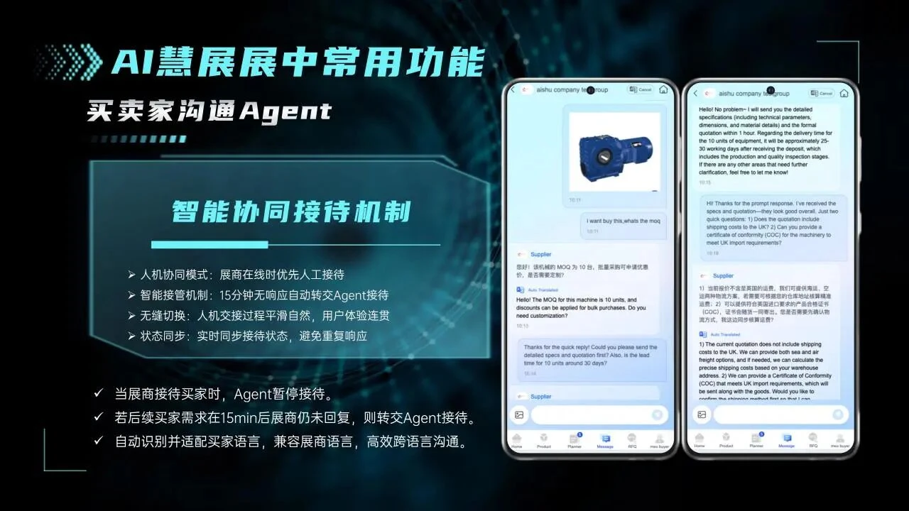 在本届印尼联展现场,随处可见展位上放置的展会现场AI Agent立牌,这是米奥兰特AI慧展的一大核心服务,为展商配备了一个“永不疲倦的智能接待官”,助力展商高效对接印尼买家。AI Agent自动生成各渠道跟进内容,定制化营销需求,一键满足,闭展即下班。买卖家沟通Agent支持自动建群,买家在米奥兰特预展平台浏览展品时,可直接通过产品页的“Contact”入口发起咨询,消息将实时、多语言、多格式直达展商;若展商未能及时回复,集成企业定制知识库的AI Agent将7×24小时自动接待,精准应答,确保每一条商机都不被遗漏。